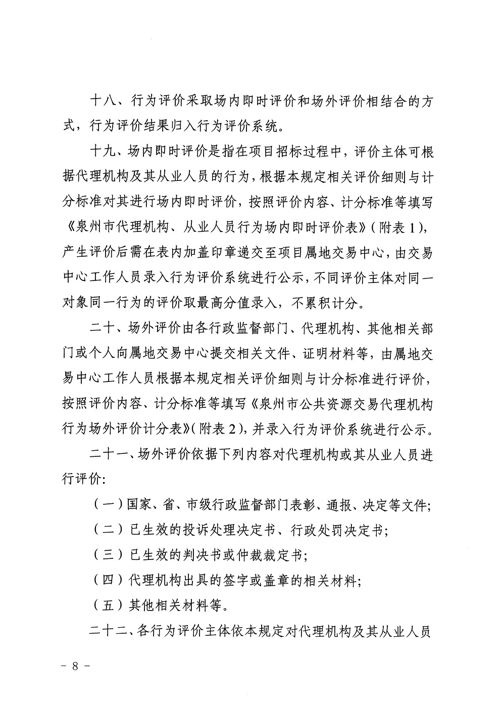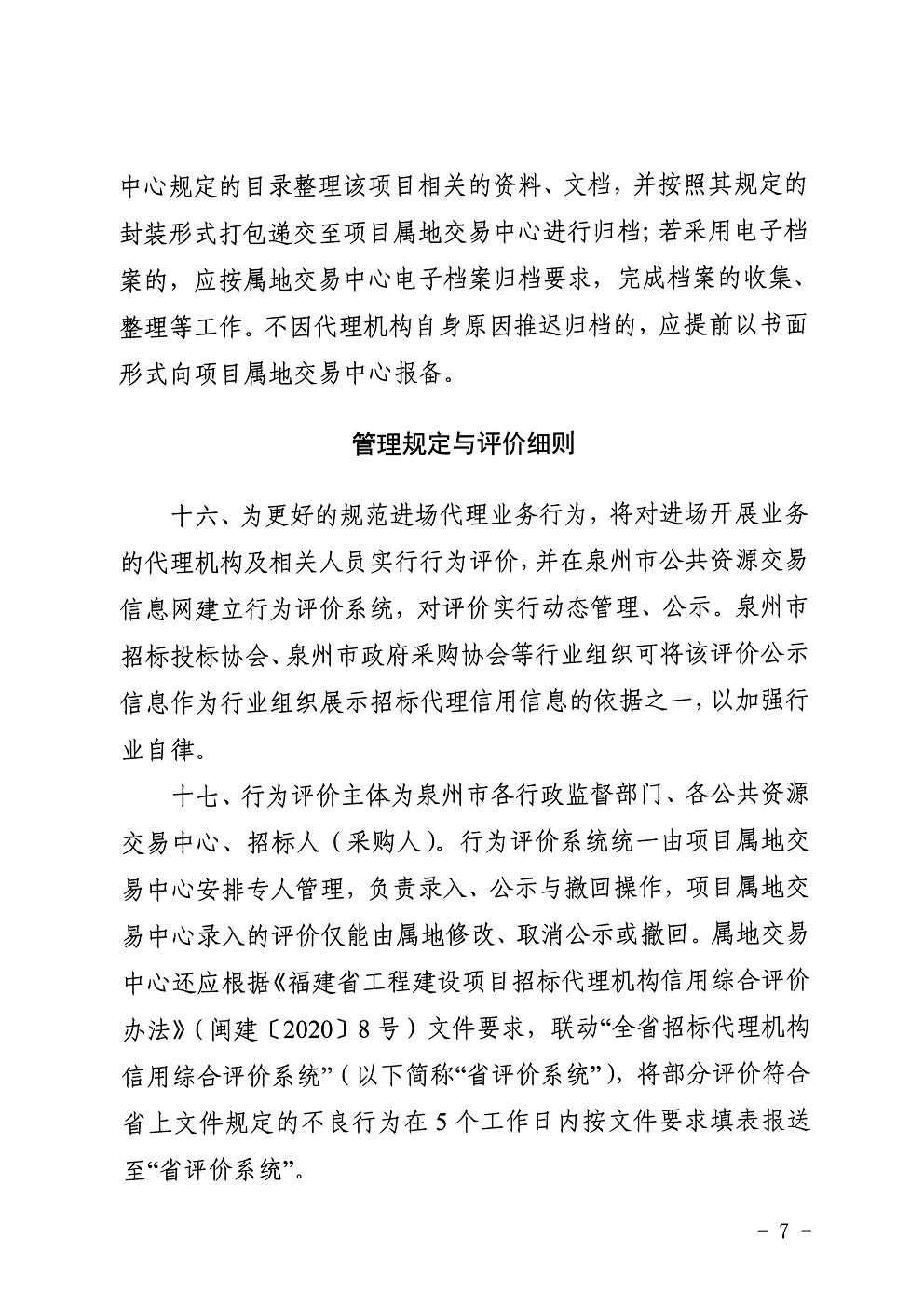 泉州市发展和改革委员会等七部门关于印发《泉州市招标代理机构及从业人员进场交易行为规范与评价管理规定》的通知